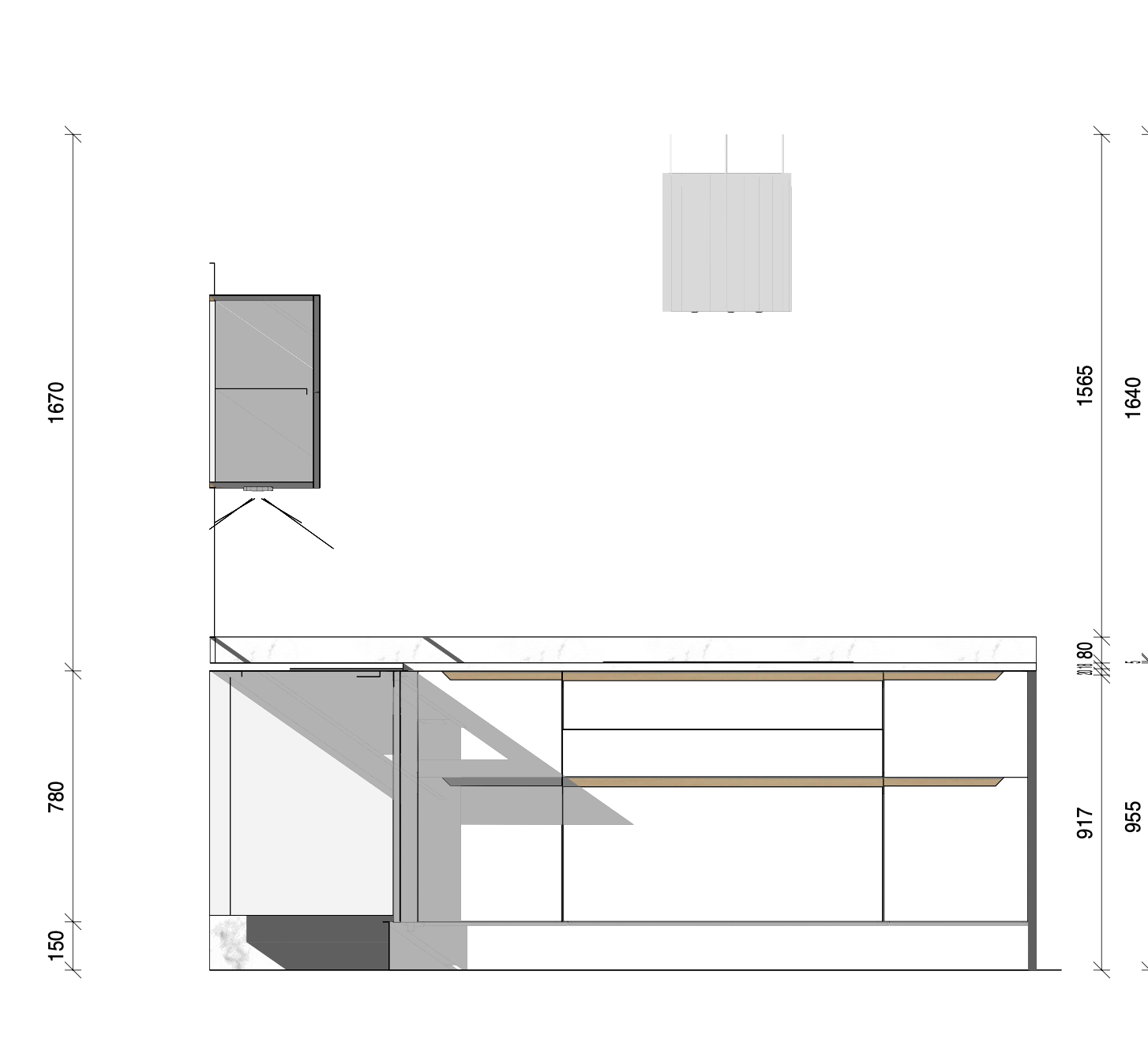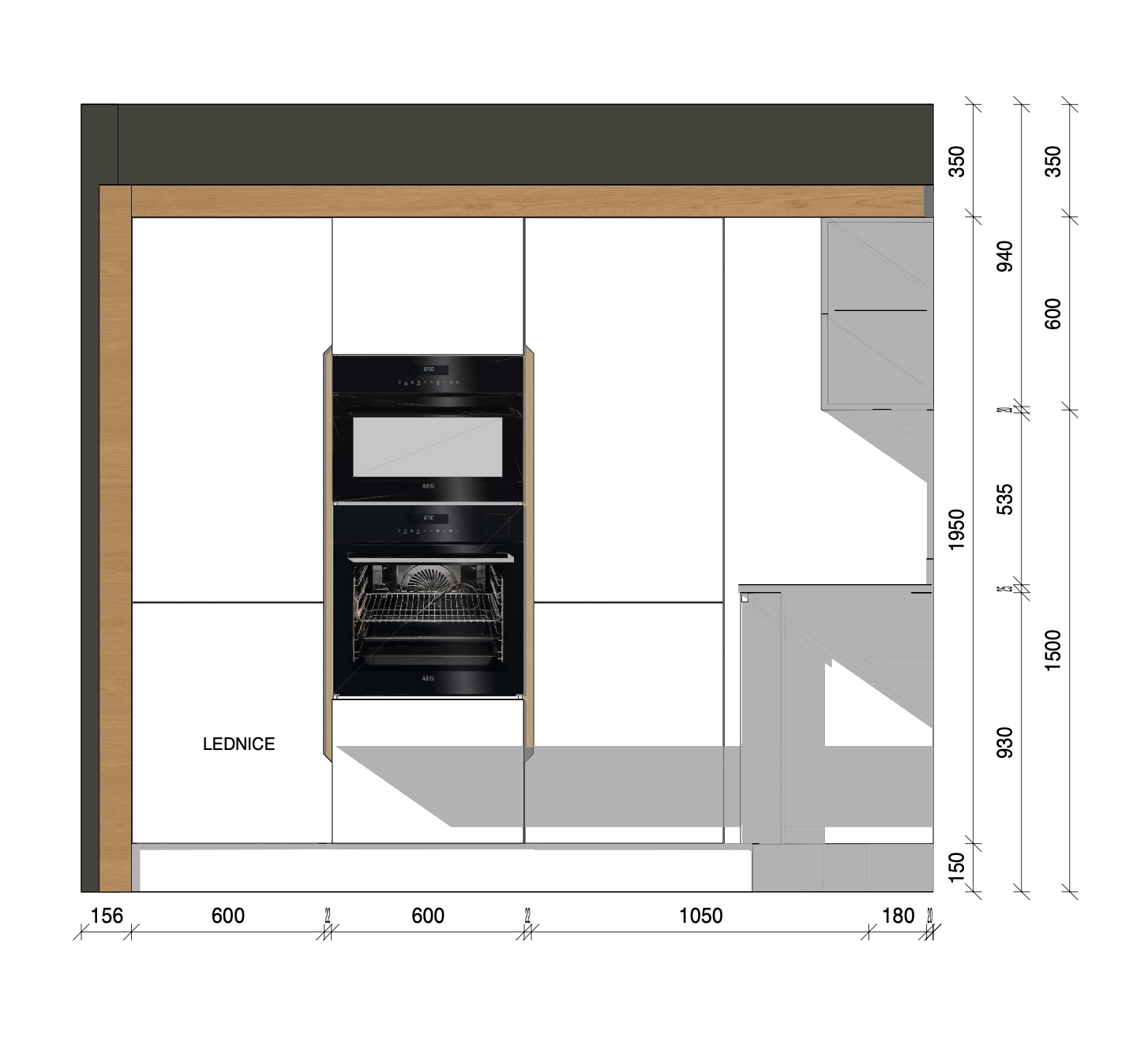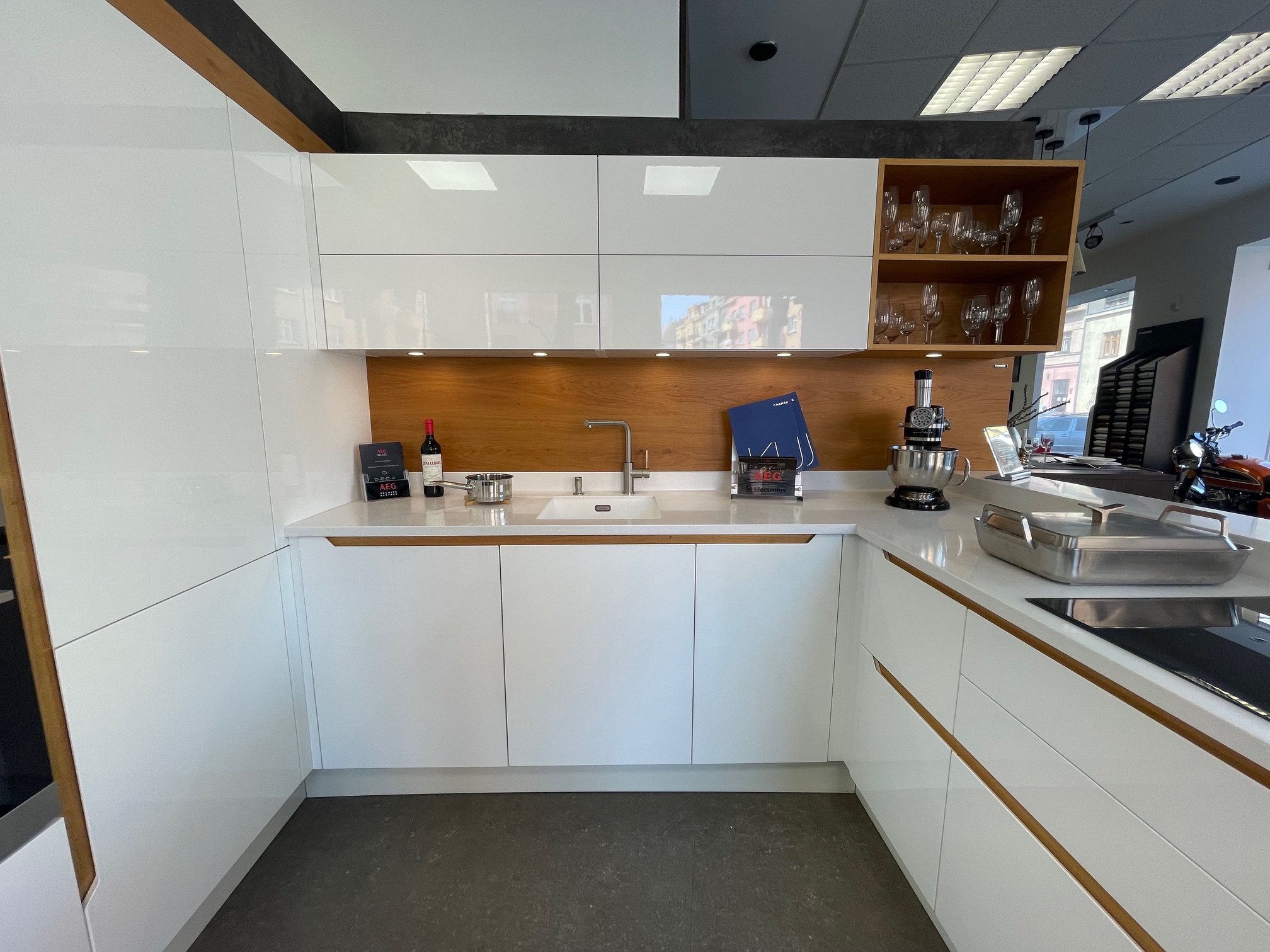 Bílá polar lak/dýha Dub rustikal OLD. Pracovní deska Corian Antartica včetně dřezu. Spotřebiče AEG. Sanita Blanco a Franke.
