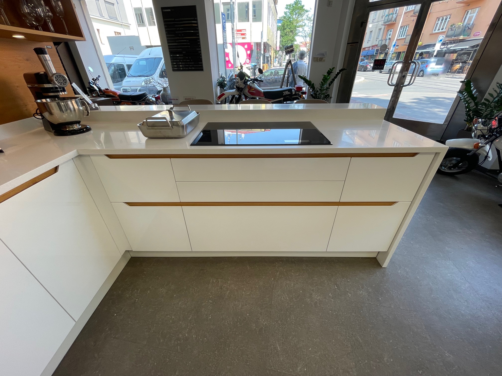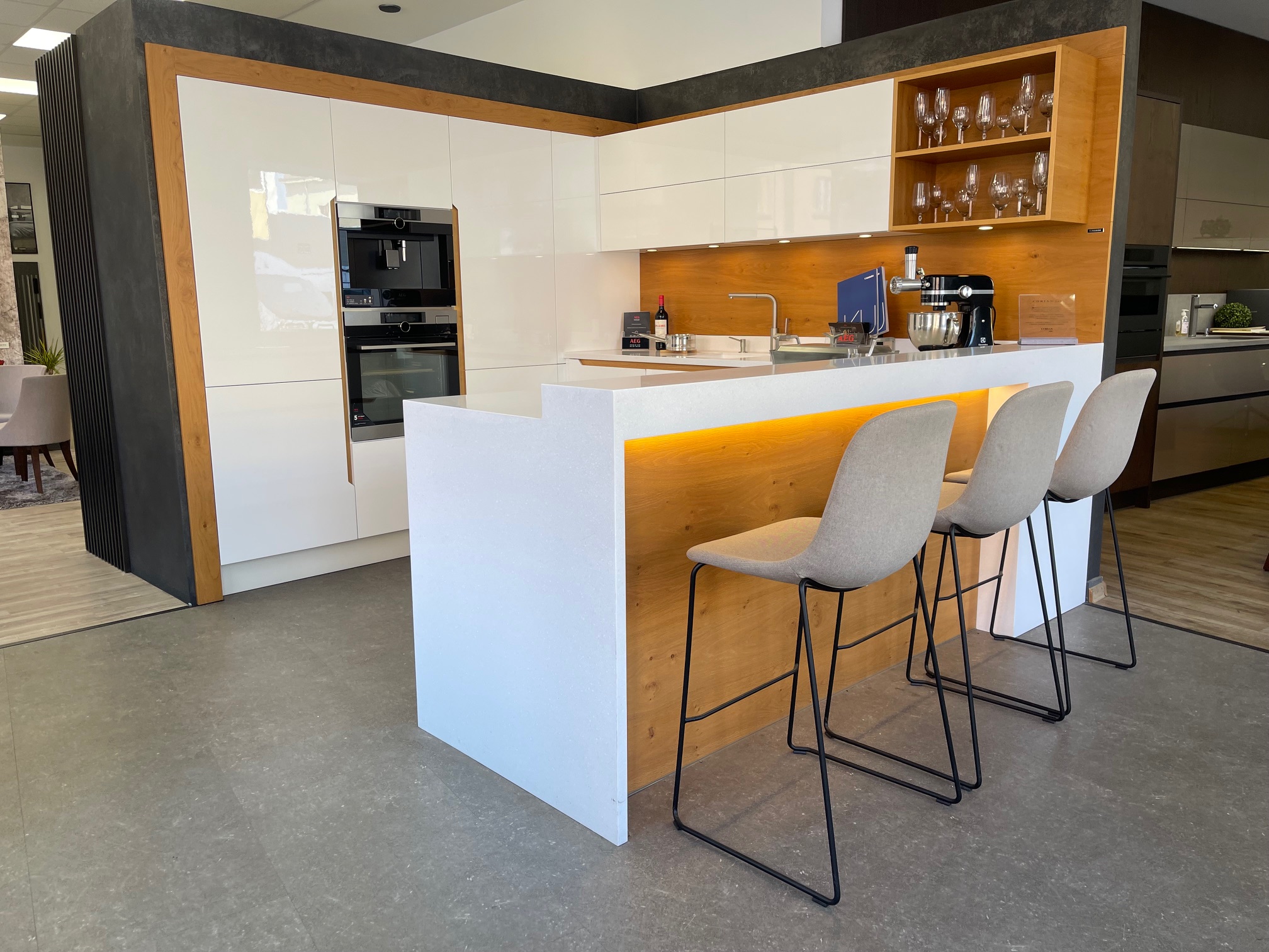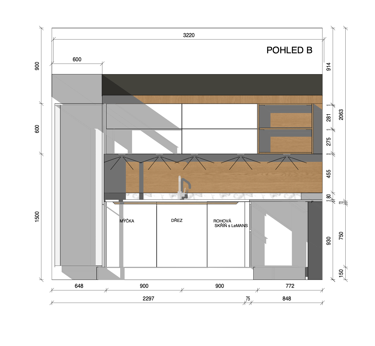 Bílá polar lak/dýha Dub rustikal OLD. Pracovní deska Corian Antartica včetně dřezu. Spotřebiče AEG. Sanita Blanco a Franke.