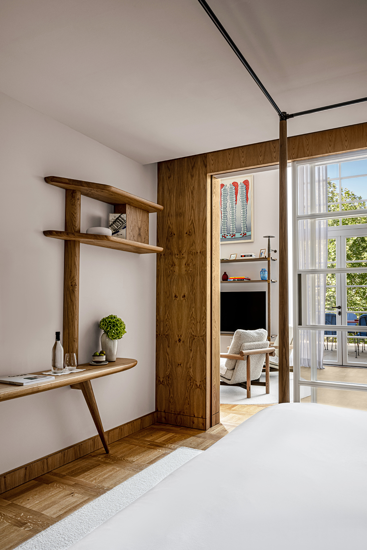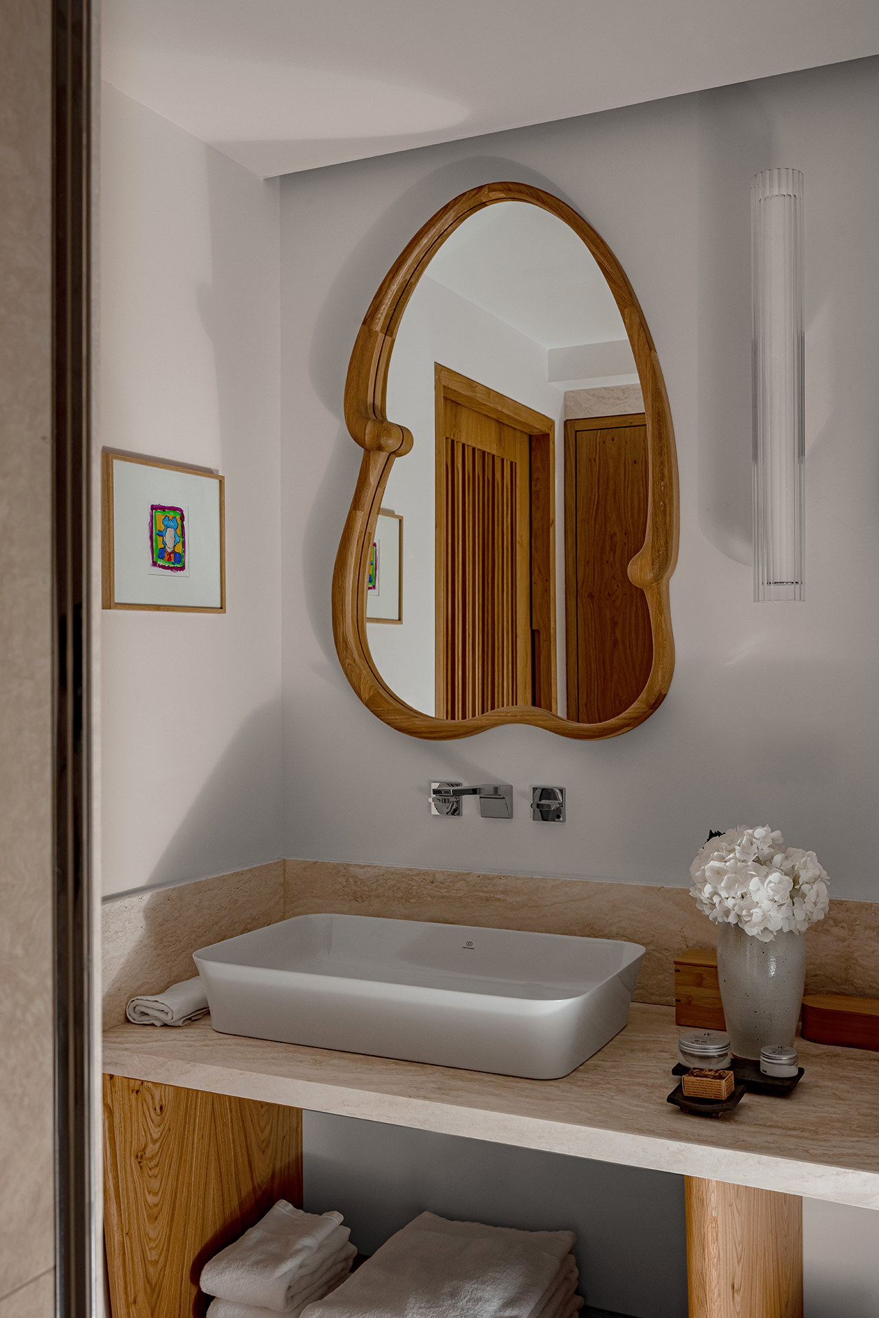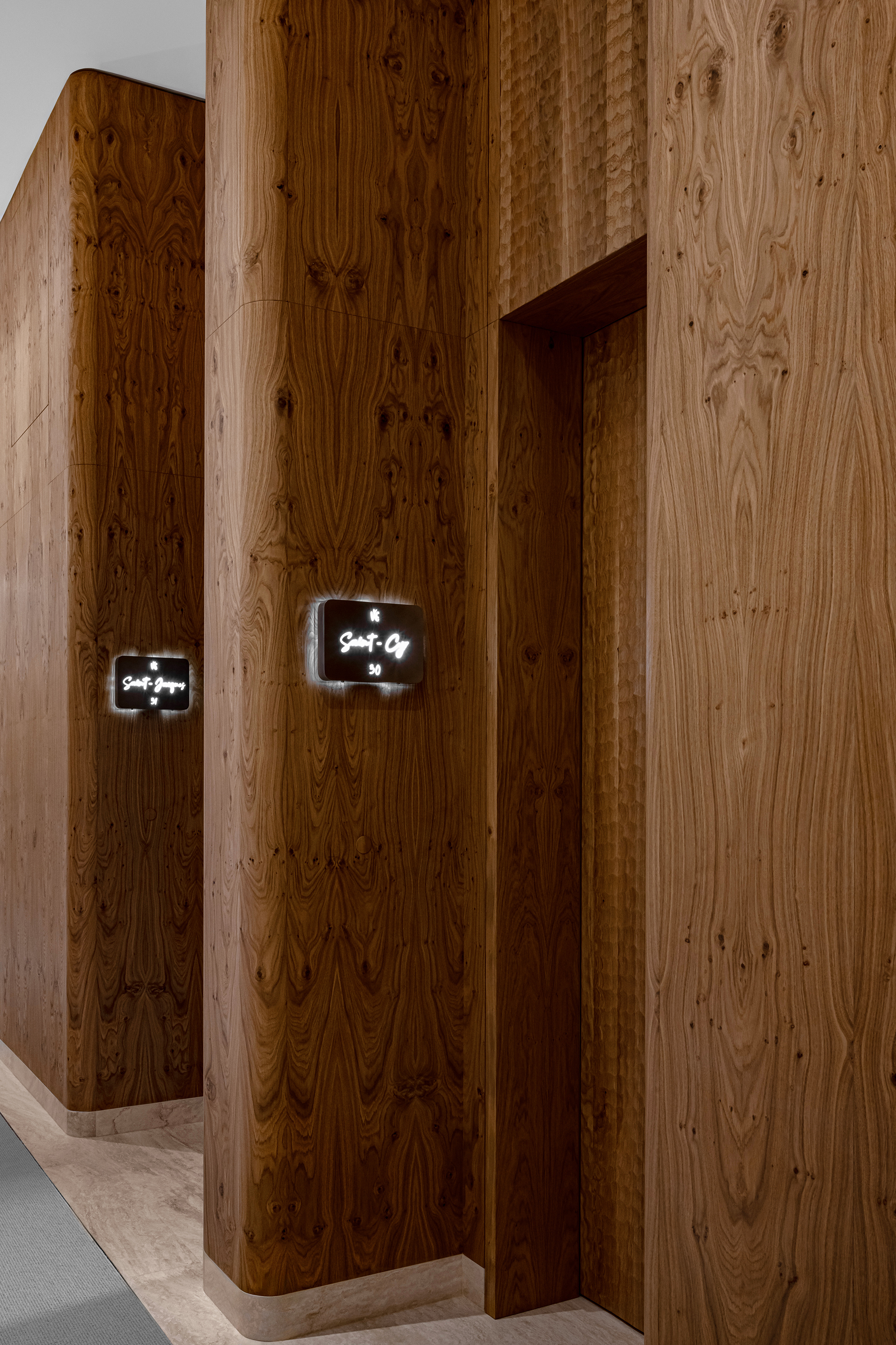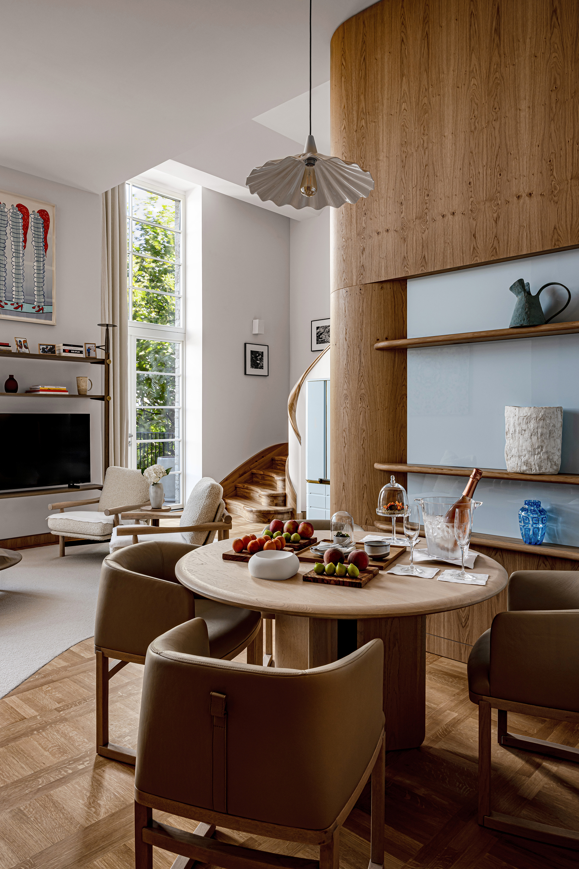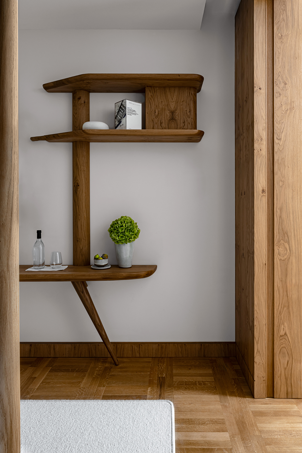 Celý interiér sjednocuje dýha dub očkový přírodní, použitá nejen na nábytku, ale také na obložení stěn a dalších prvcích. Její jedinečná kresba vnáší do prostoru hloubku, hřejivou eleganci a organický charakter. Precizně navazující plochy tvoří harmonický celek nesoucí podpis řemeslného mistrovství, zatímco přírodní materiály podtrhují autenticitu a nadčasovou kvalitu.
