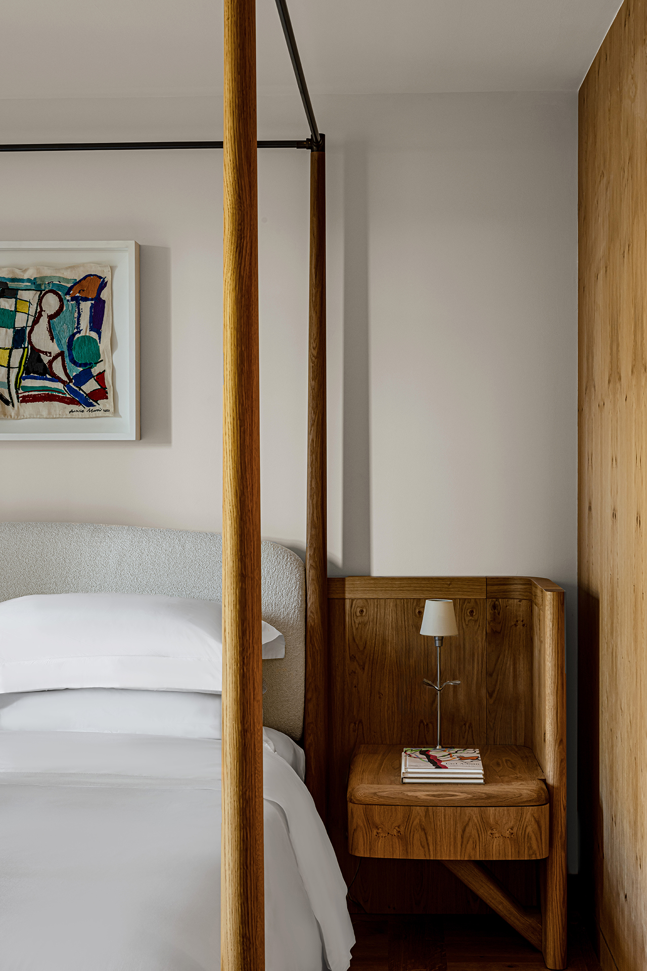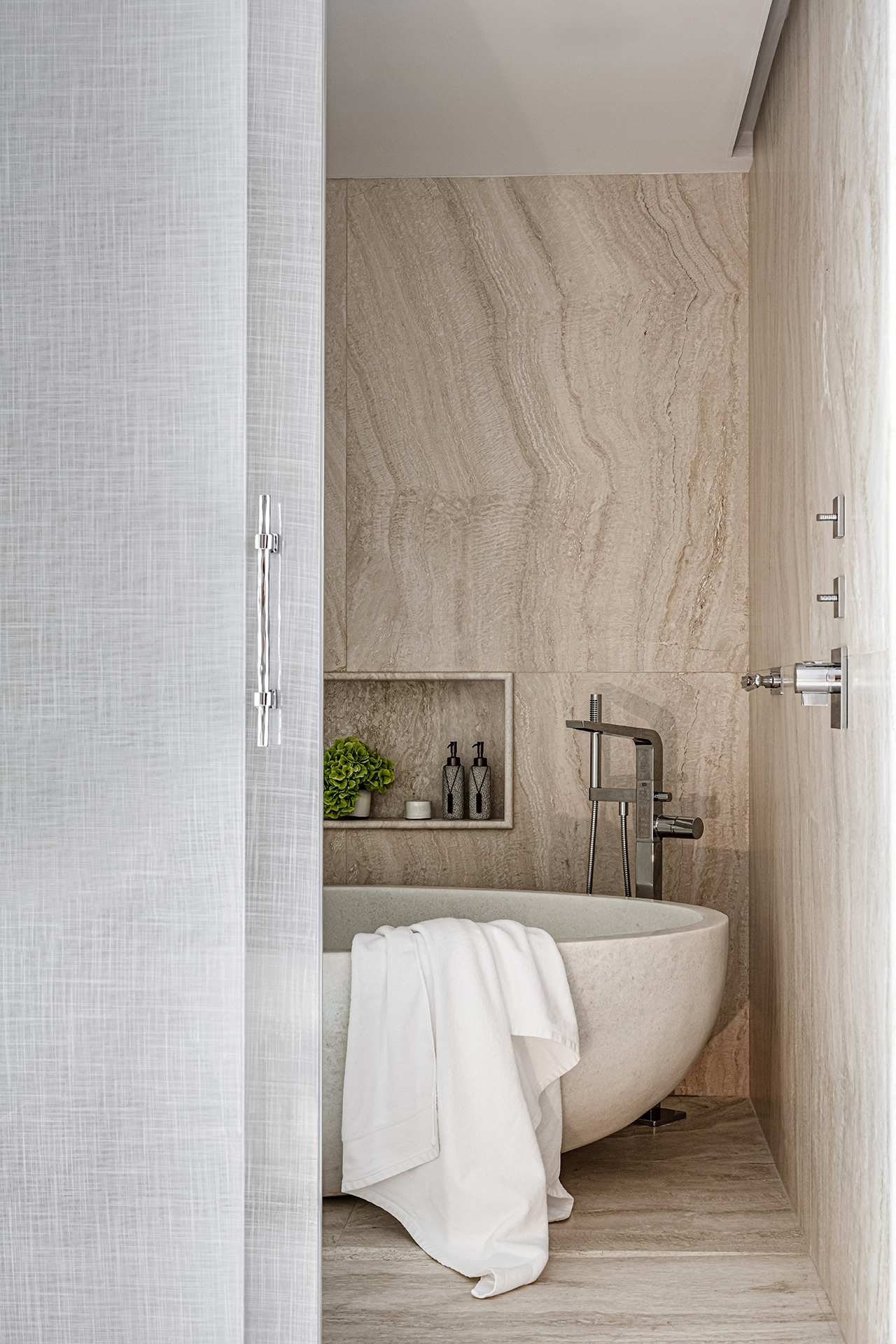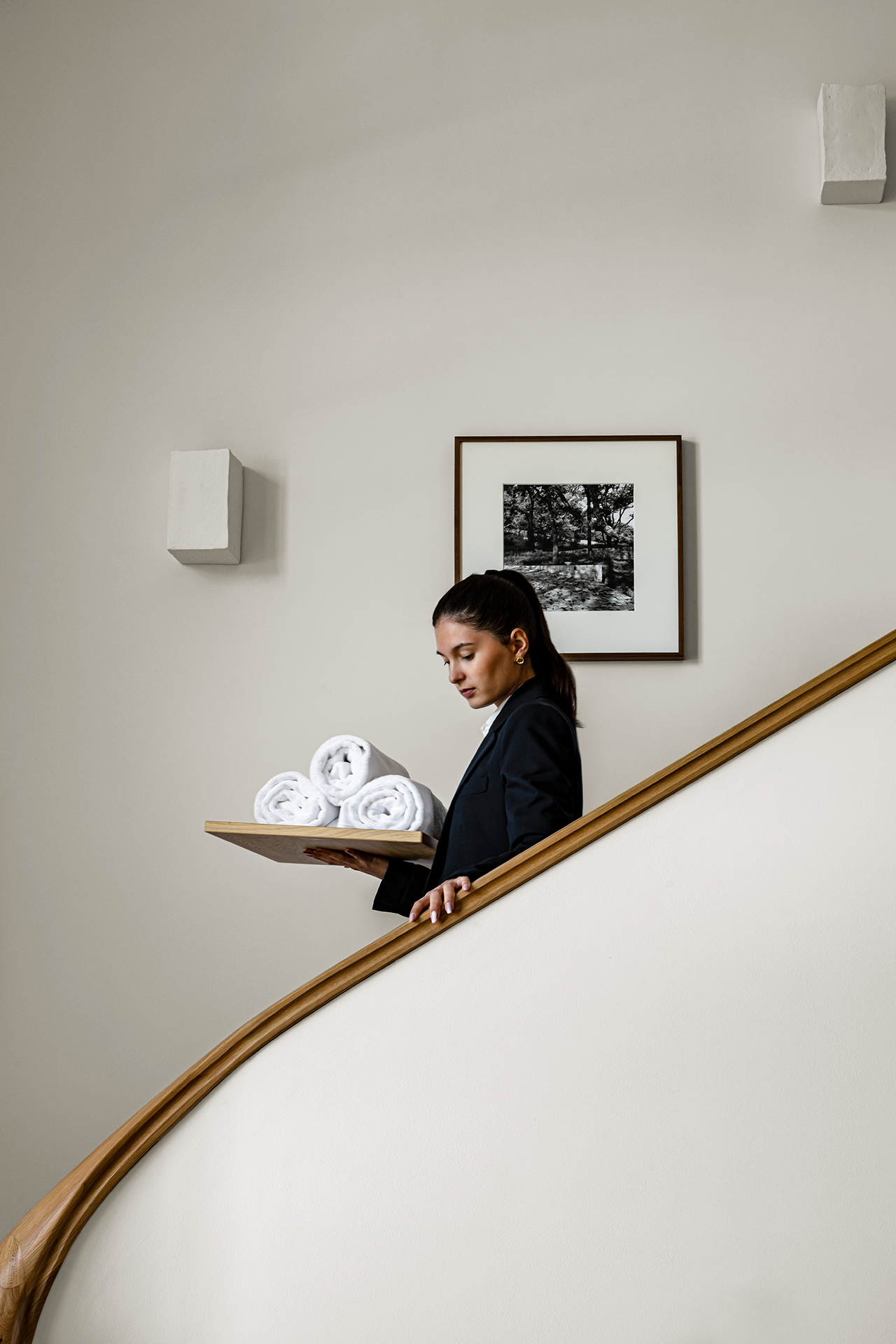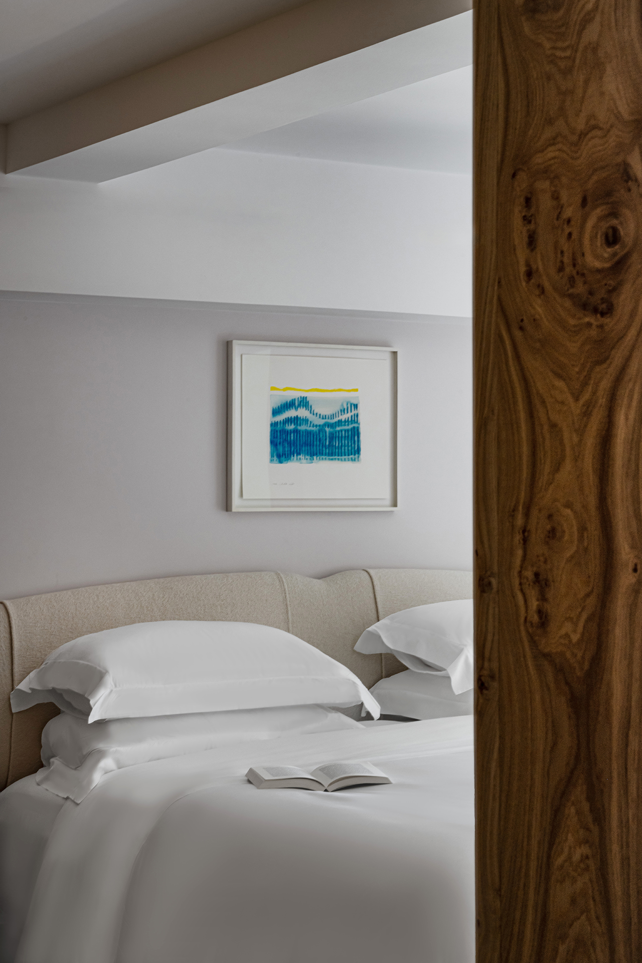 Naše práce zde vtiskla podobu exkluzivním apartmánům, navrženým a realizovaným v duchu zcela atypických řešení. Každý detail byl pečlivě promyšlen – od ručně dlabaných dveří, které jsou manifestem řemeslné zručnosti a extrémní preciznosti, přes postele čalouněné prémiovými materiály až po ikonický bar v blankytně modrém vysokém lesku. Ten byl vytvořen výhradně pro tento projekt a jeho výjimečnost zvýrazňují detaily z leštěné mosazi, jemné kožené obložení a prvky z kaleného skla.