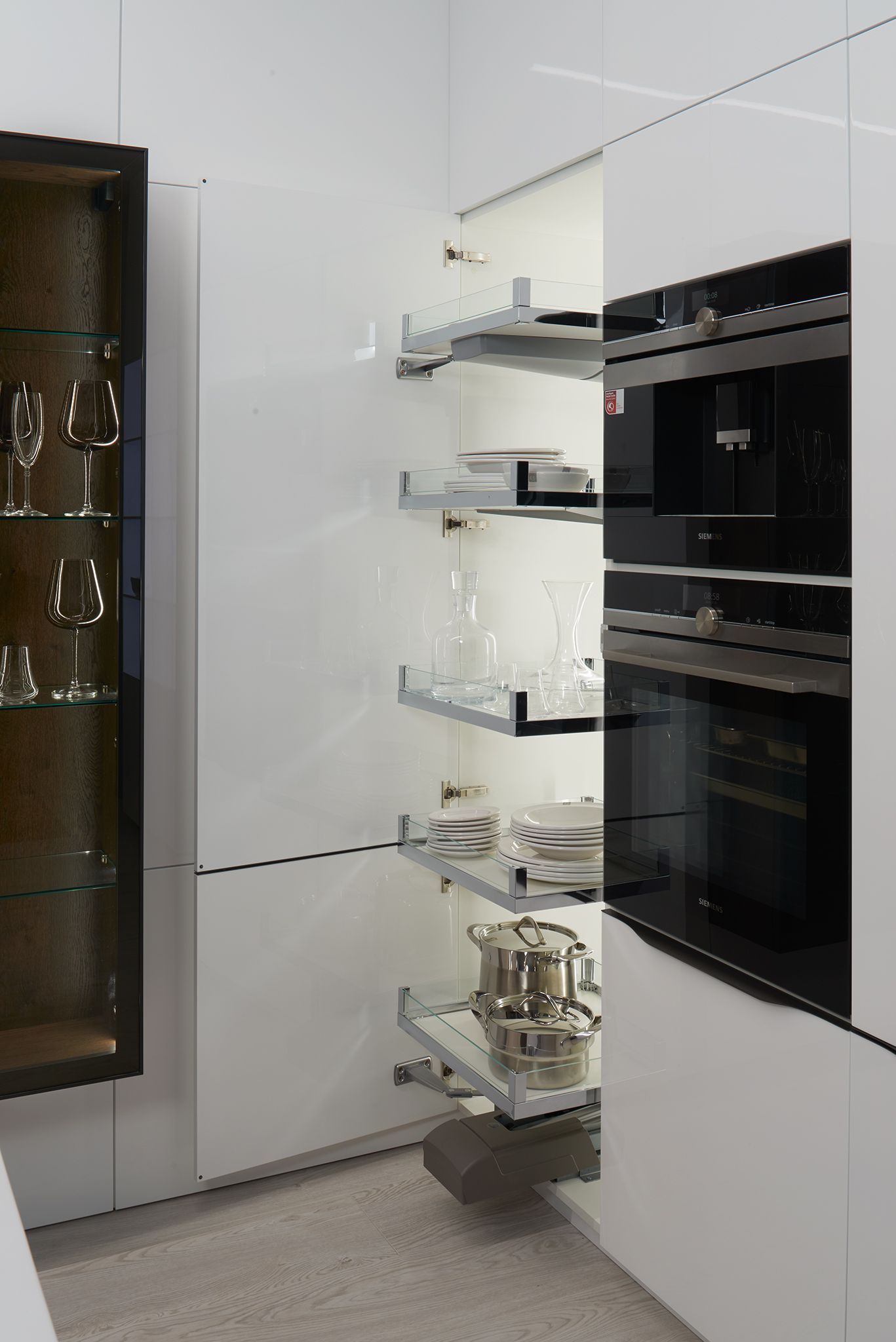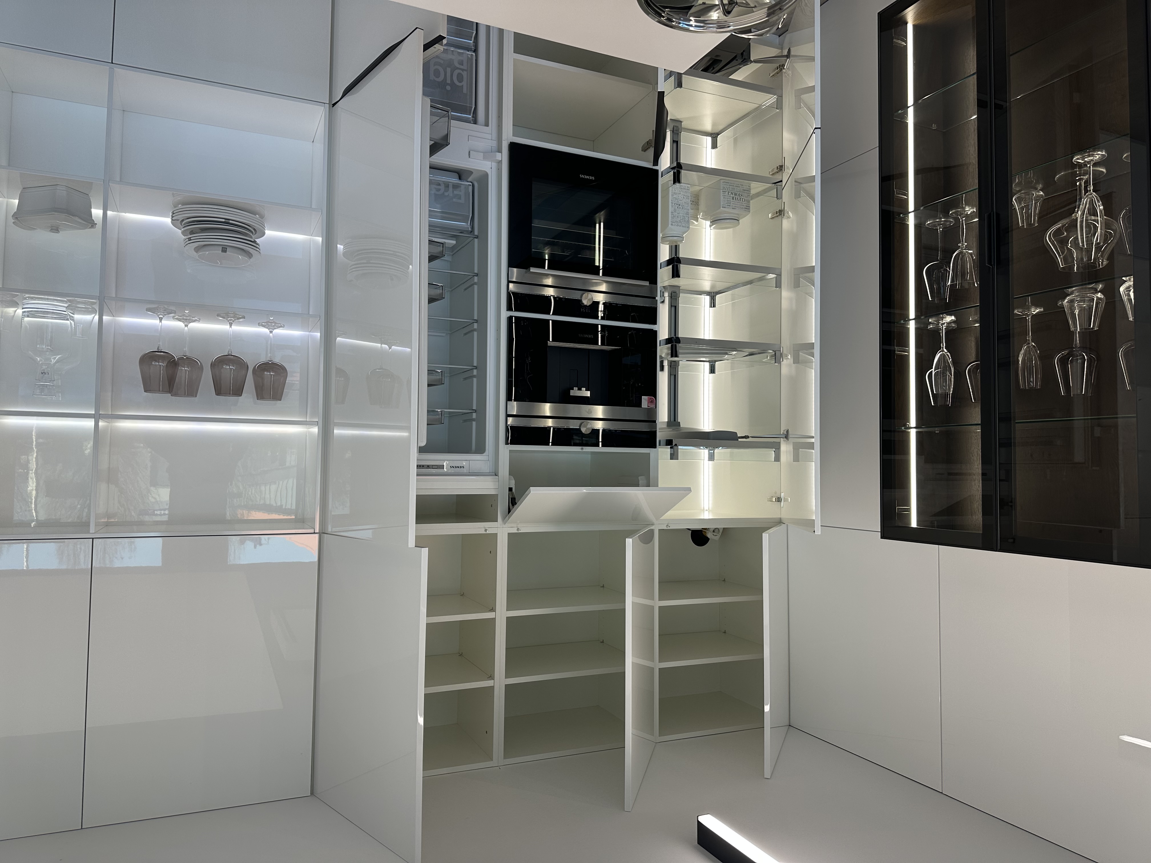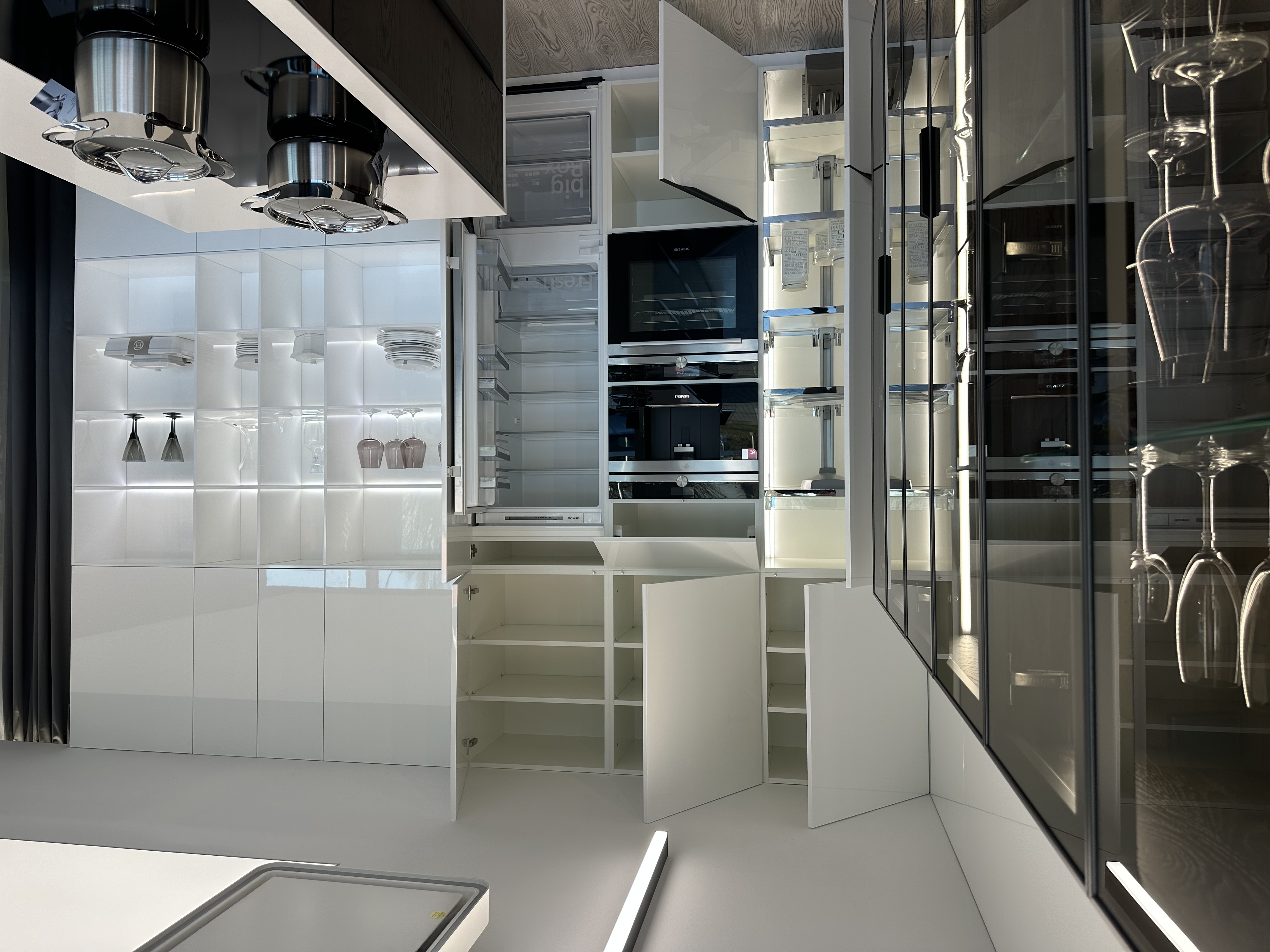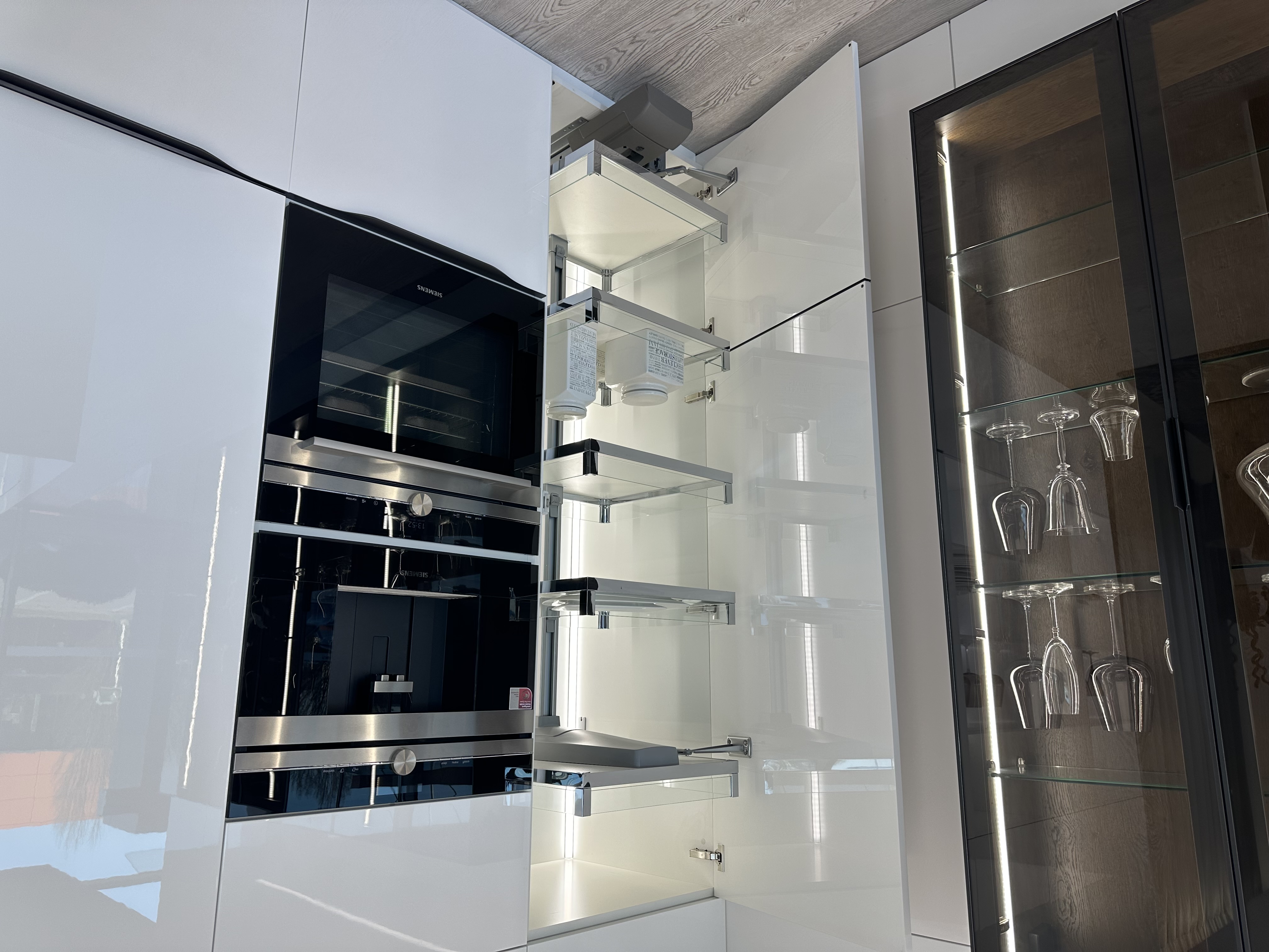 Výprodejový nábytek. Spotřebiče: kávovar siemens CT636LES1, trouba siemens HS658GXS1, lednice siemens KI87VVS30, indukce Novy intouch, odsavač Novy cloud 230, baterie blanco, myčka siemens SN65L034EU. Součástí kuchyně je systém Kessebohmer comfort 2.