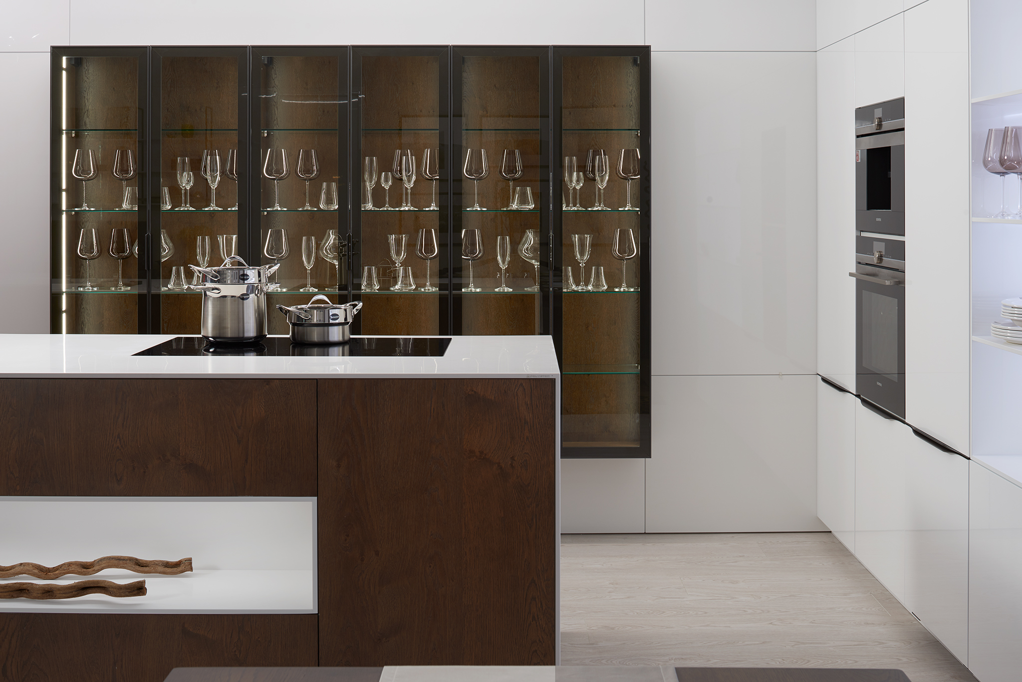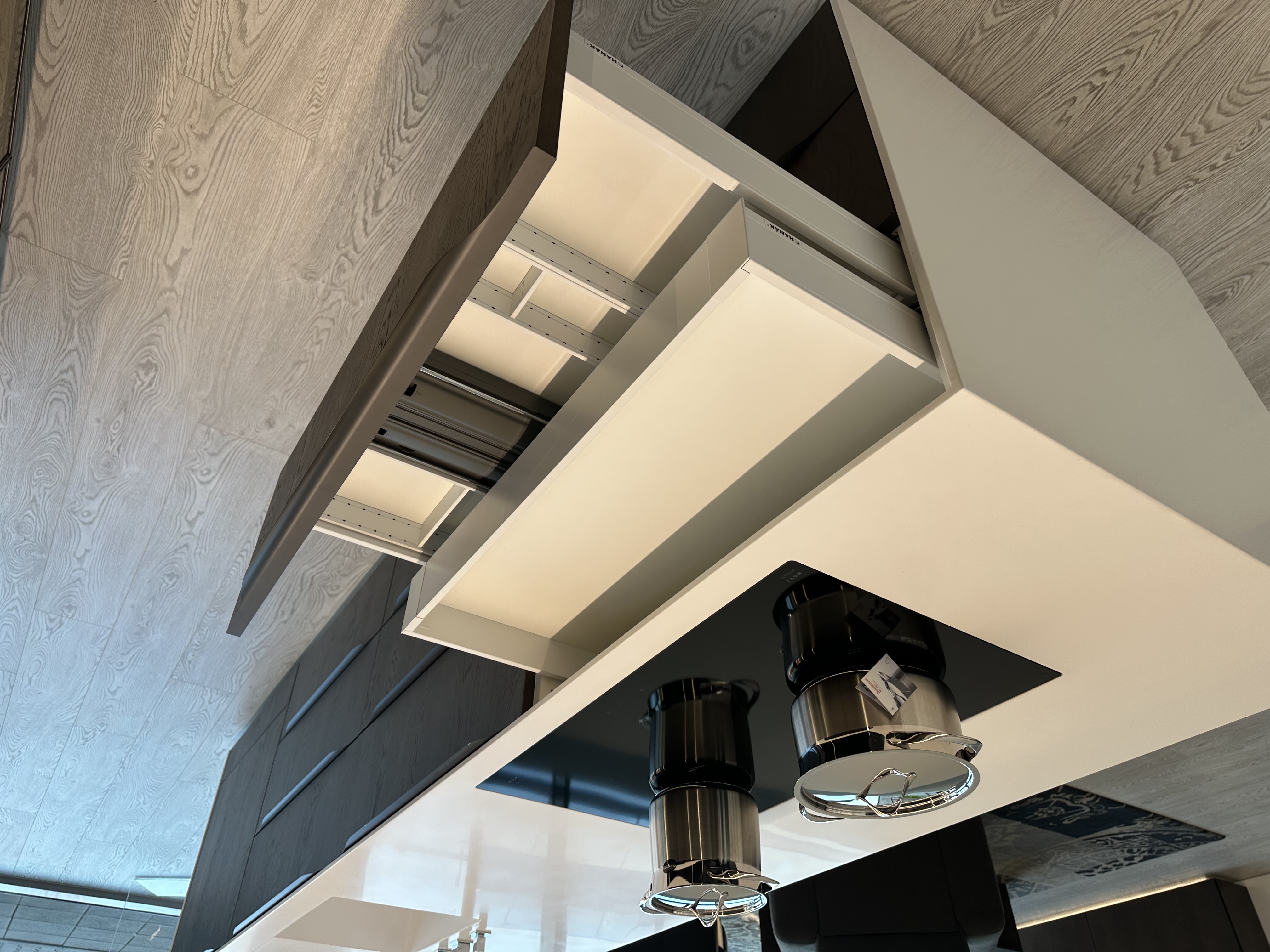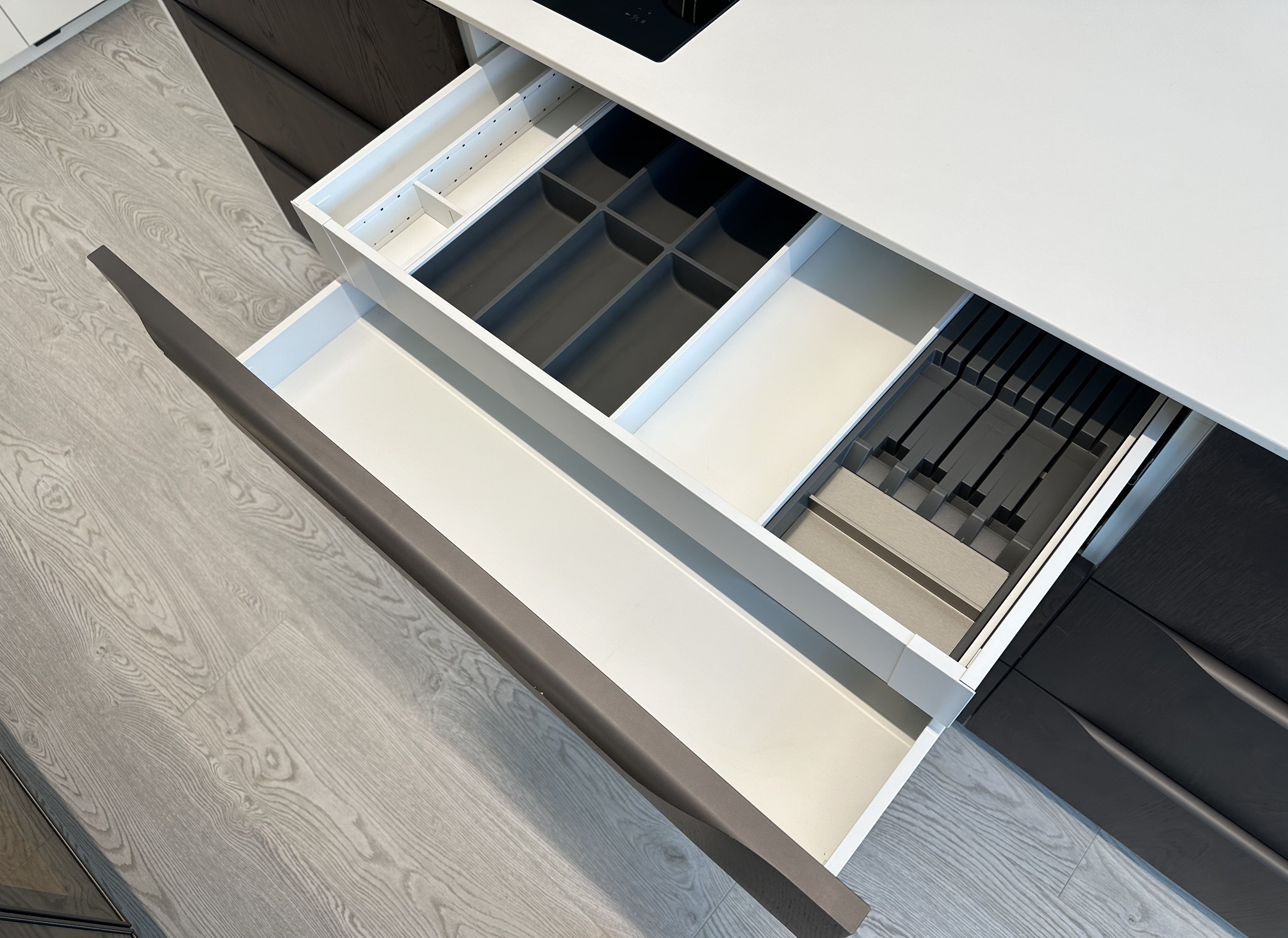 Výprodejový nábytek. Spotřebiče: kávovar siemens CT636LES1, trouba siemens HS658GXS1, lednice siemens KI87VVS30, indukce Novy intouch, odsavač Novy cloud 230, baterie blanco, myčka siemens SN65L034EU. Součástí kuchyně je systém Kessebohmer comfort 2.
