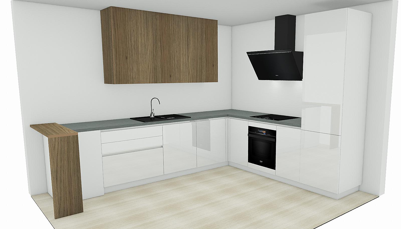 Bílý lak lesk + horní skříňky lamino dub rustikal natur