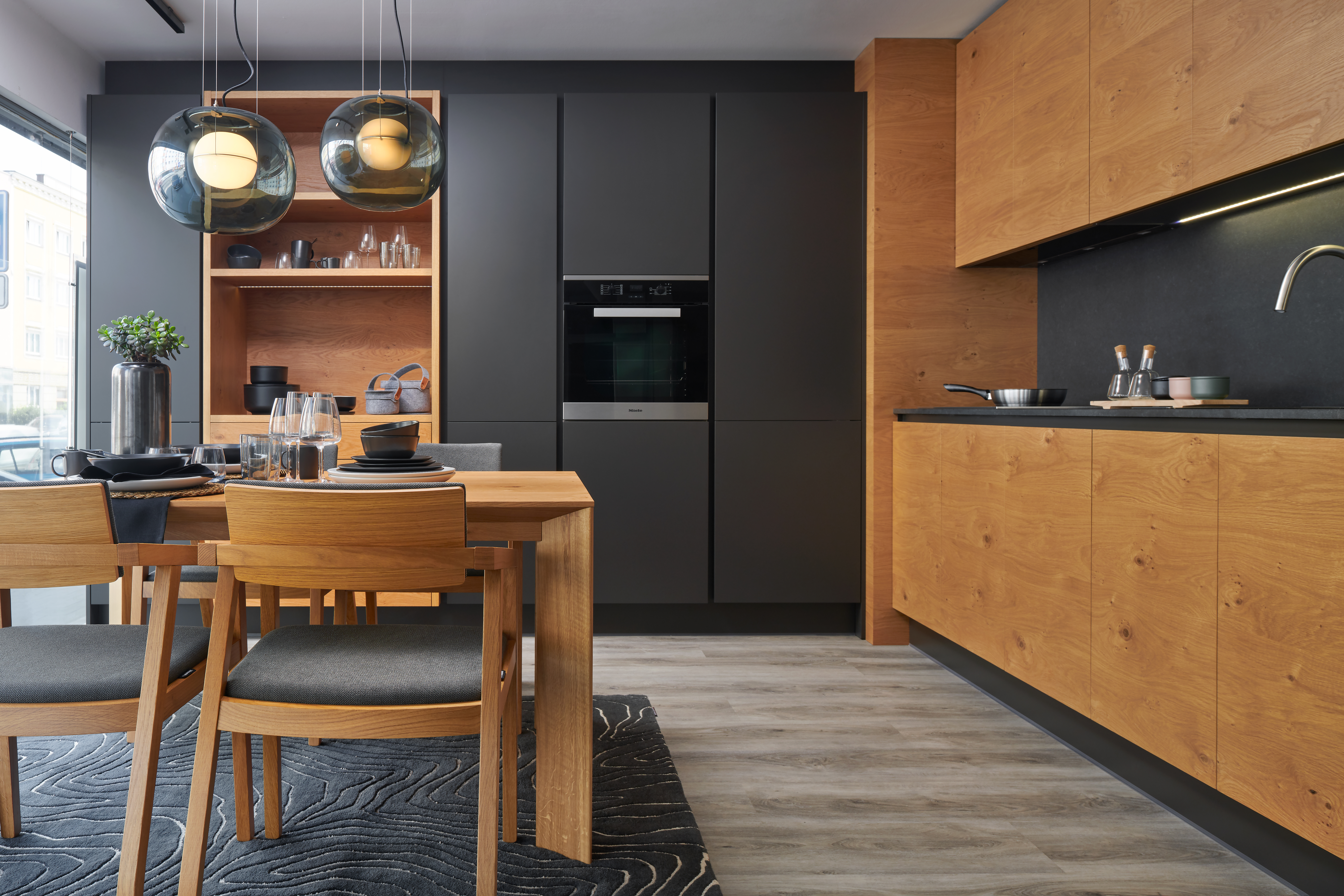 Lak mat titan + dýha dub americký přírodní OLD. Pracovní deska a zástěna přírodní žula NERO Zimbabwe.