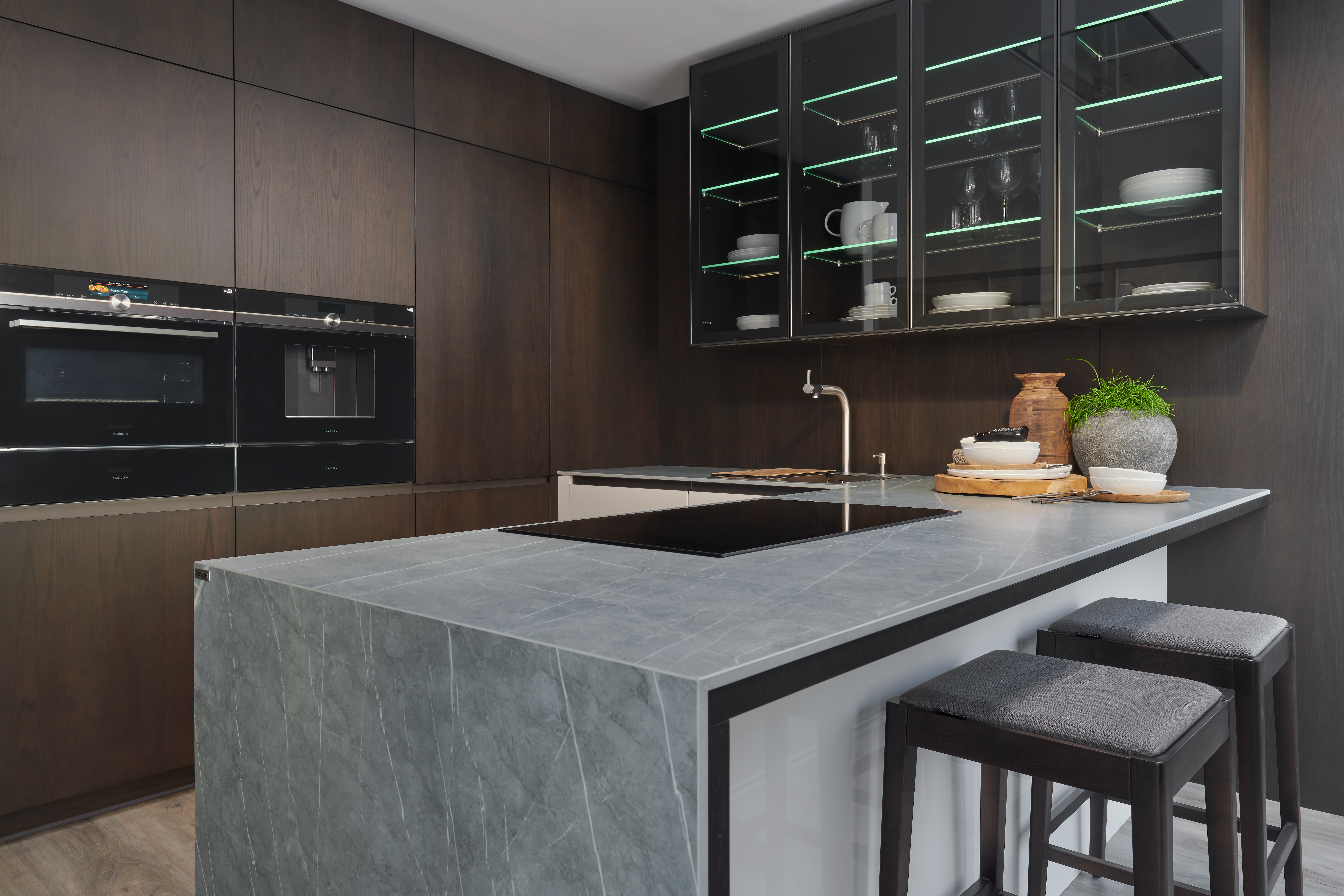 Lak lesk bílá antik + dýha dub americký carbon. Pracovní keramická deska NEOLITH.