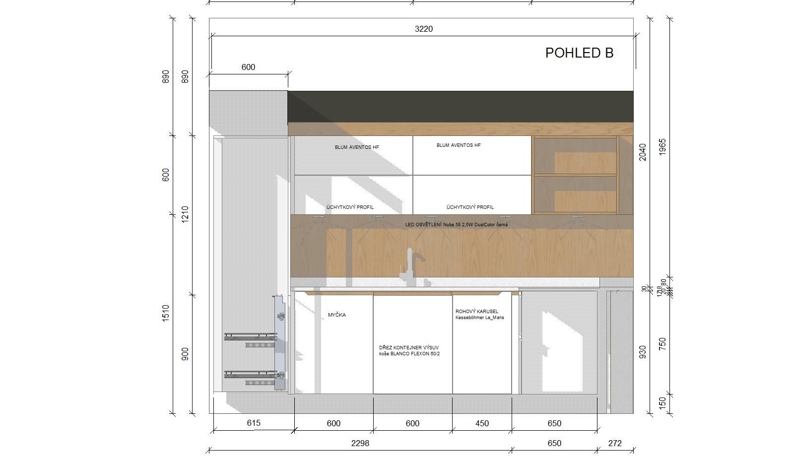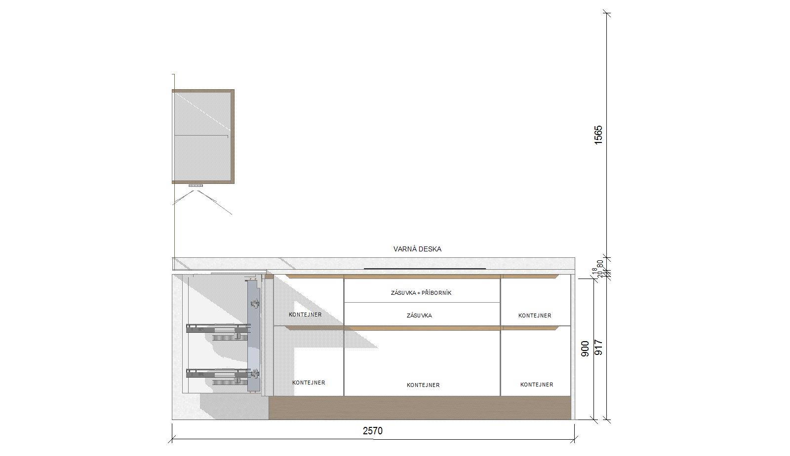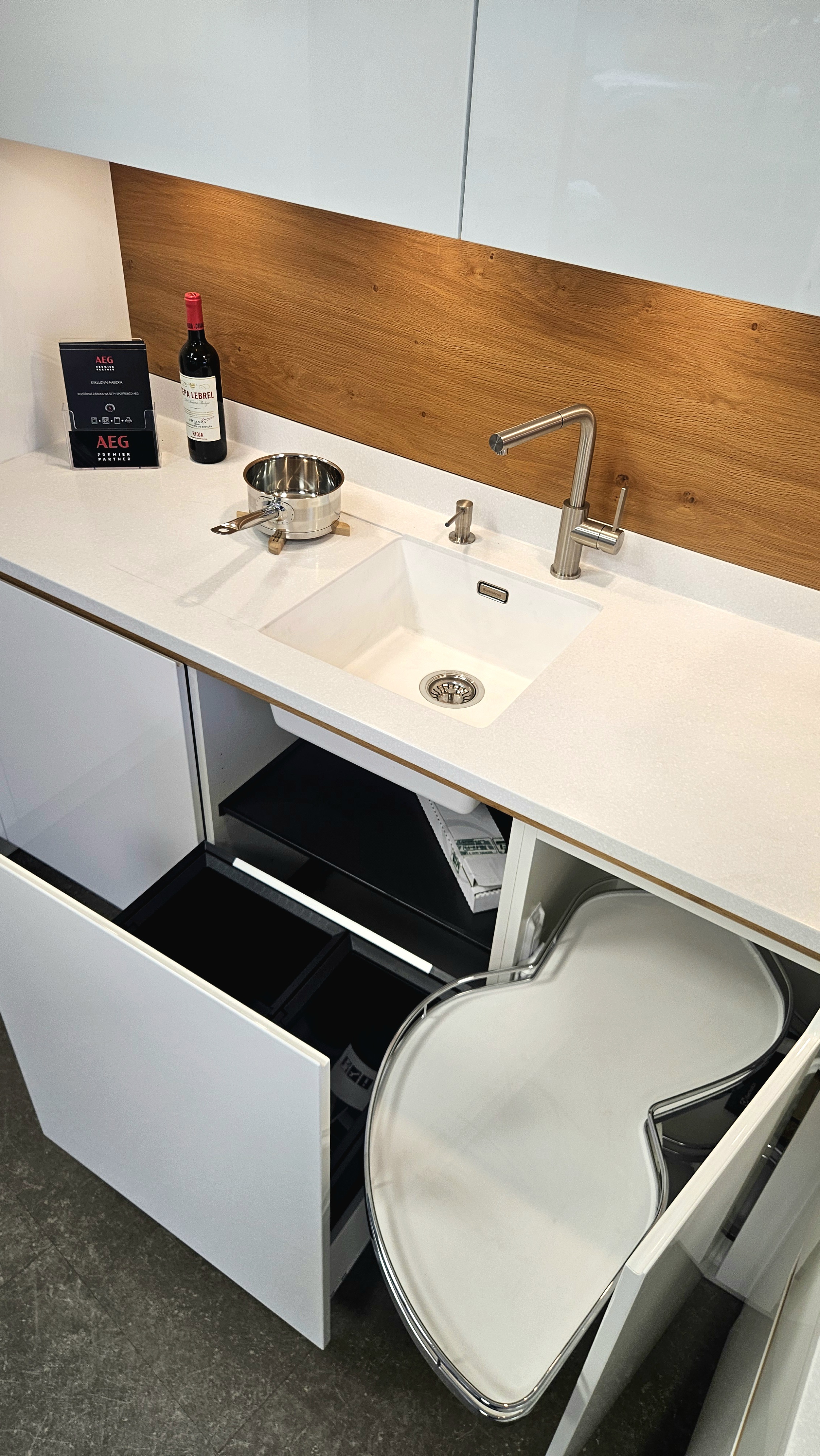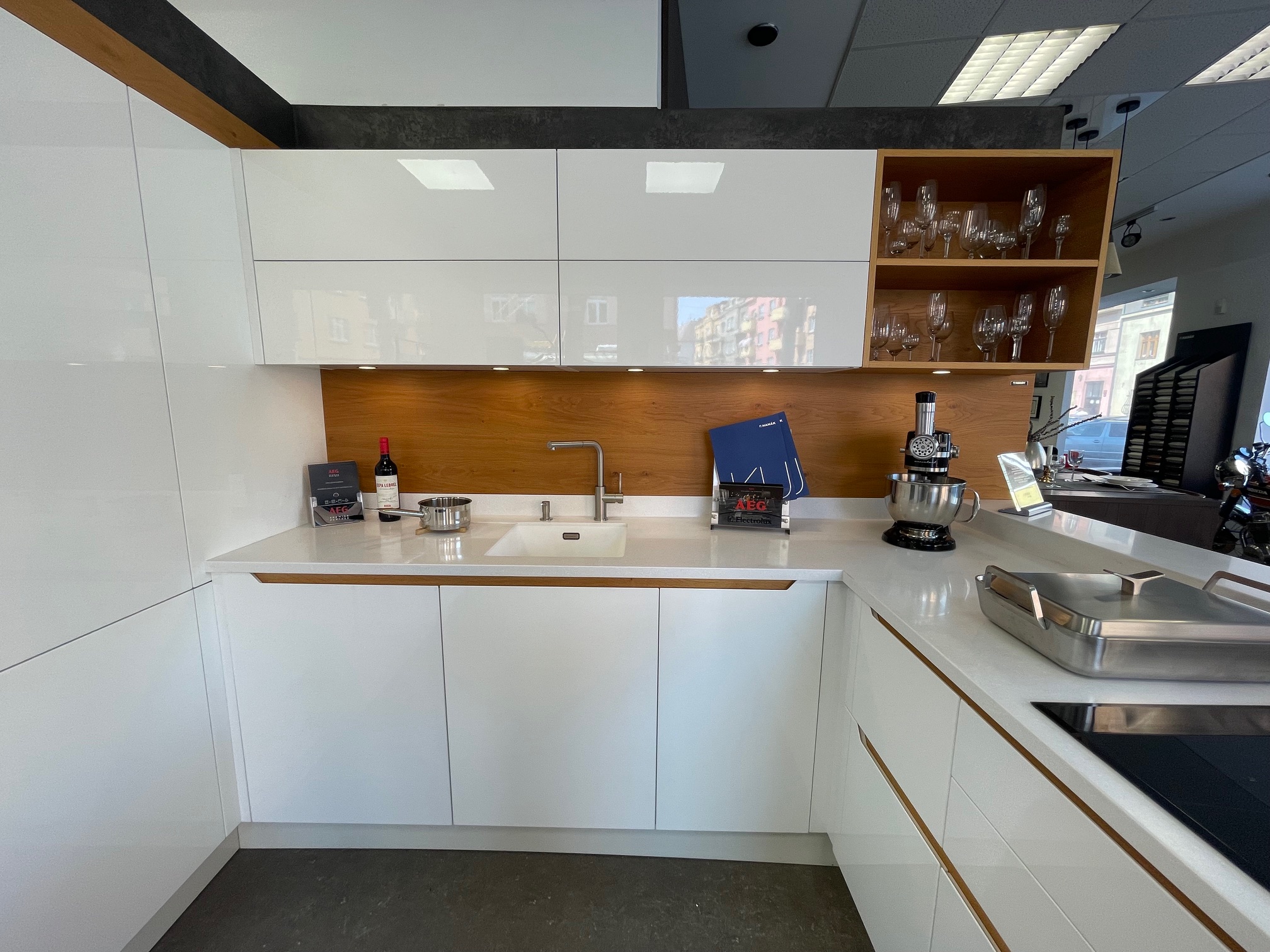 Bílá polar lak/dýha Dub rustikal OLD. Pracovní deska Corian Antartica včetně dřezu. Vnitřní vybavení Kesseböhmer a LED osvětlení.