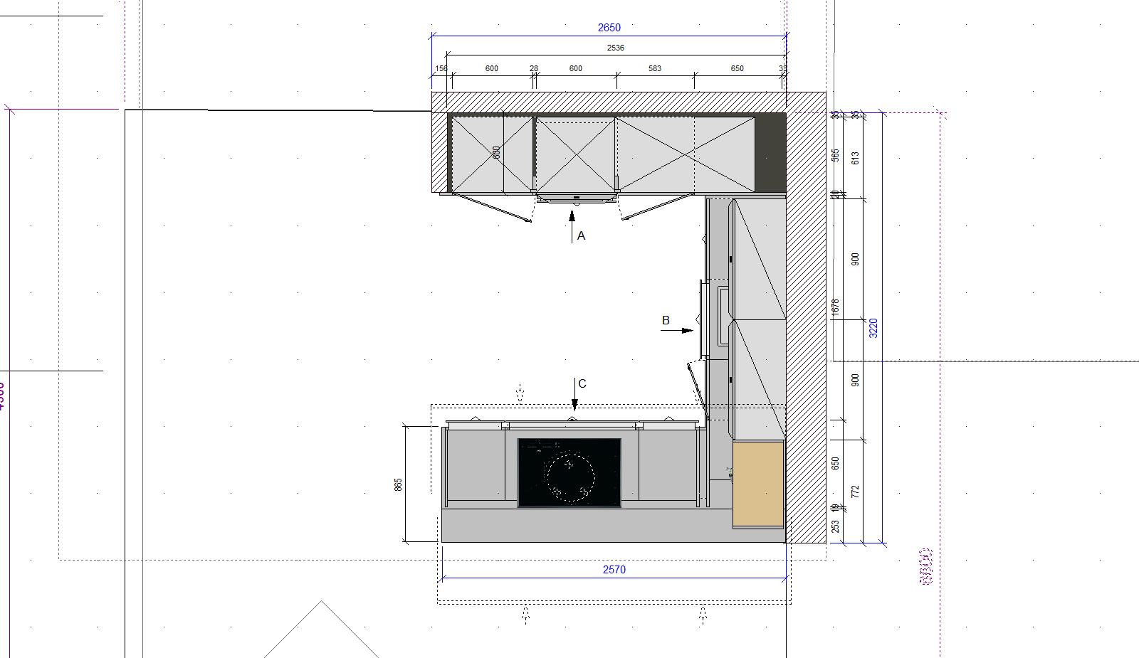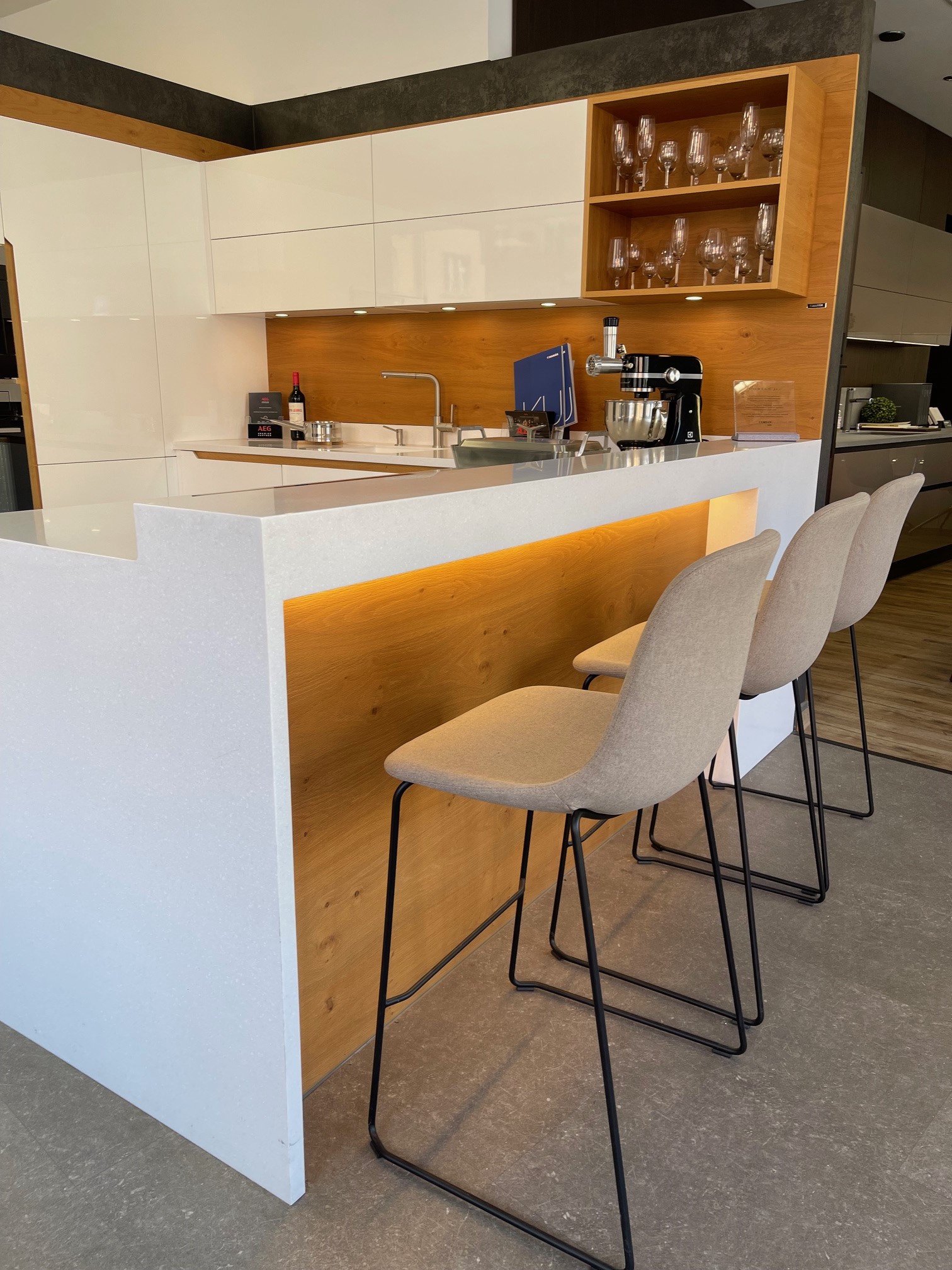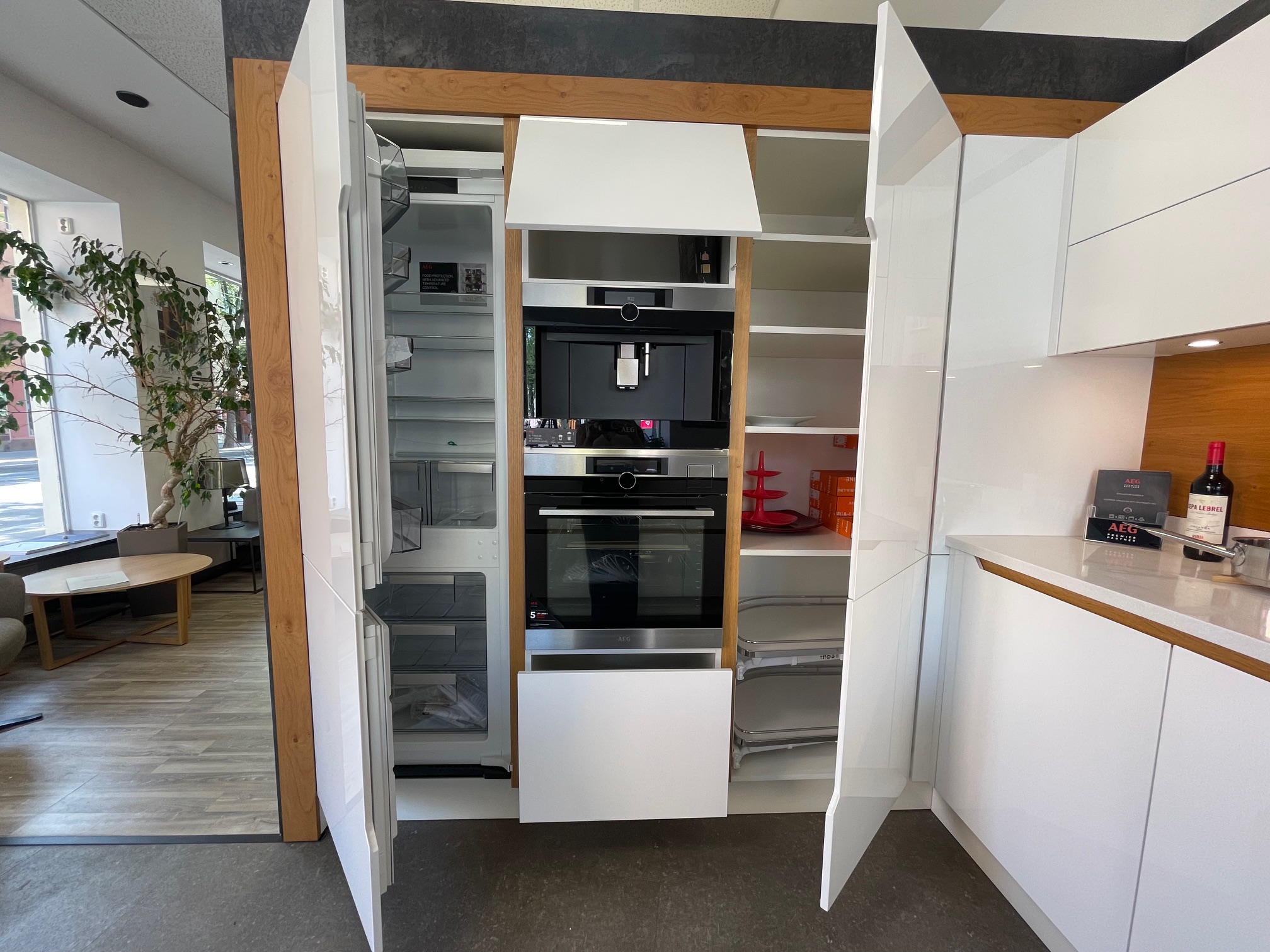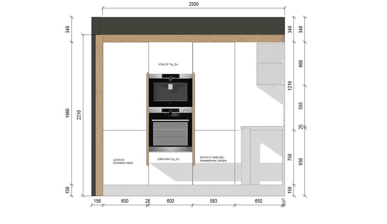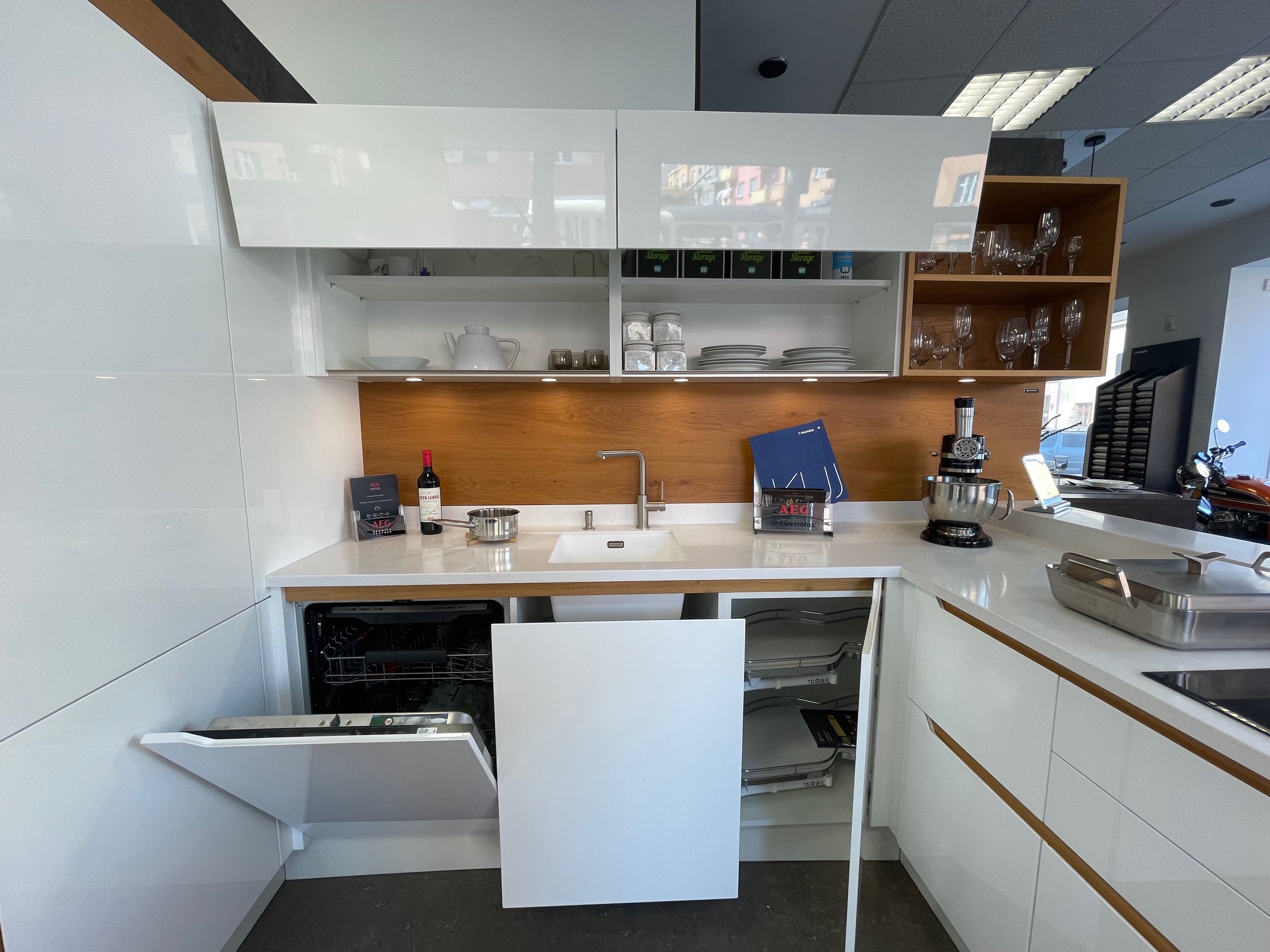 Bílá polar lak/dýha Dub rustikal OLD. Pracovní deska Corian Antartica včetně dřezu. Vnitřní vybavení Kesseböhmer a LED osvětlení.