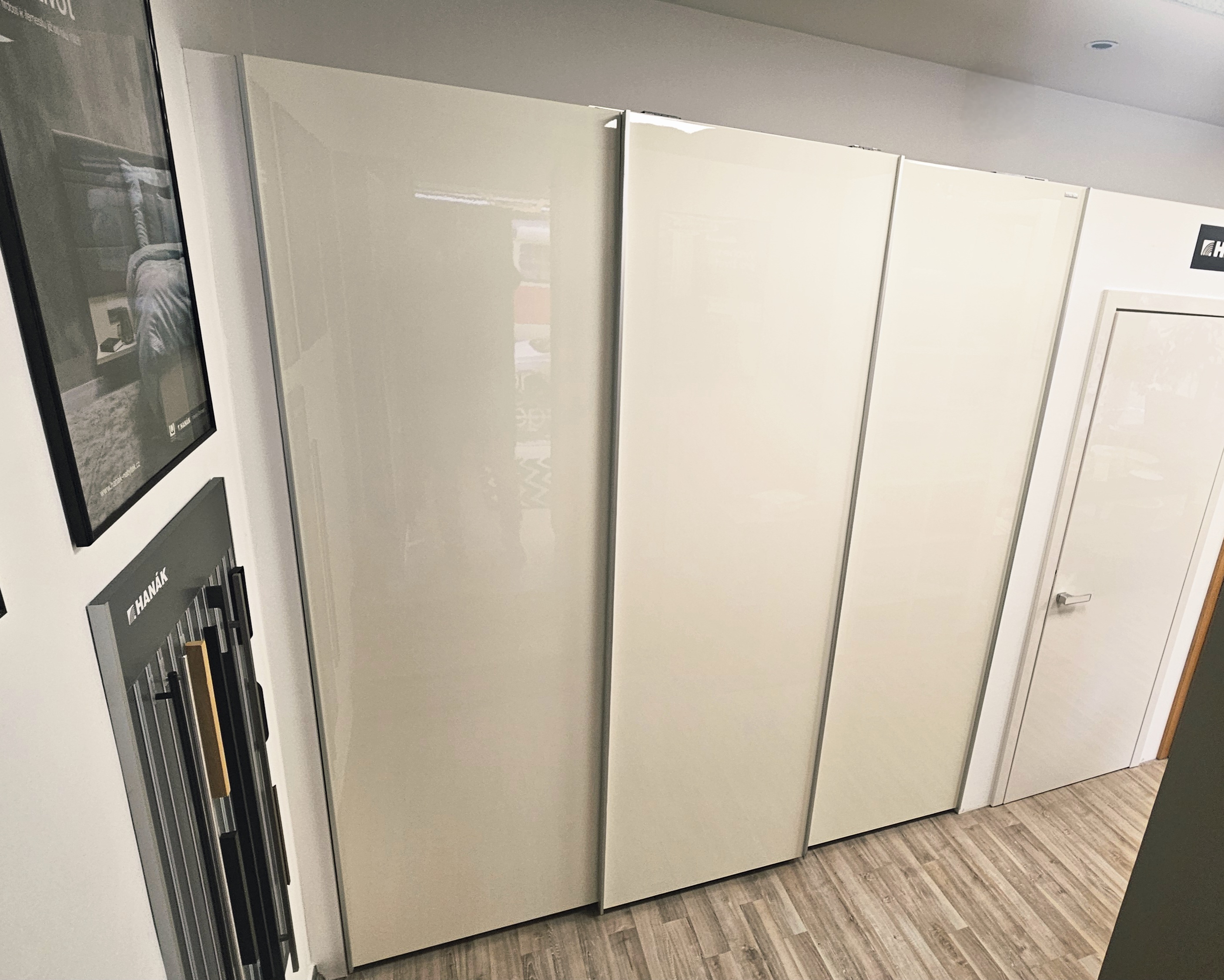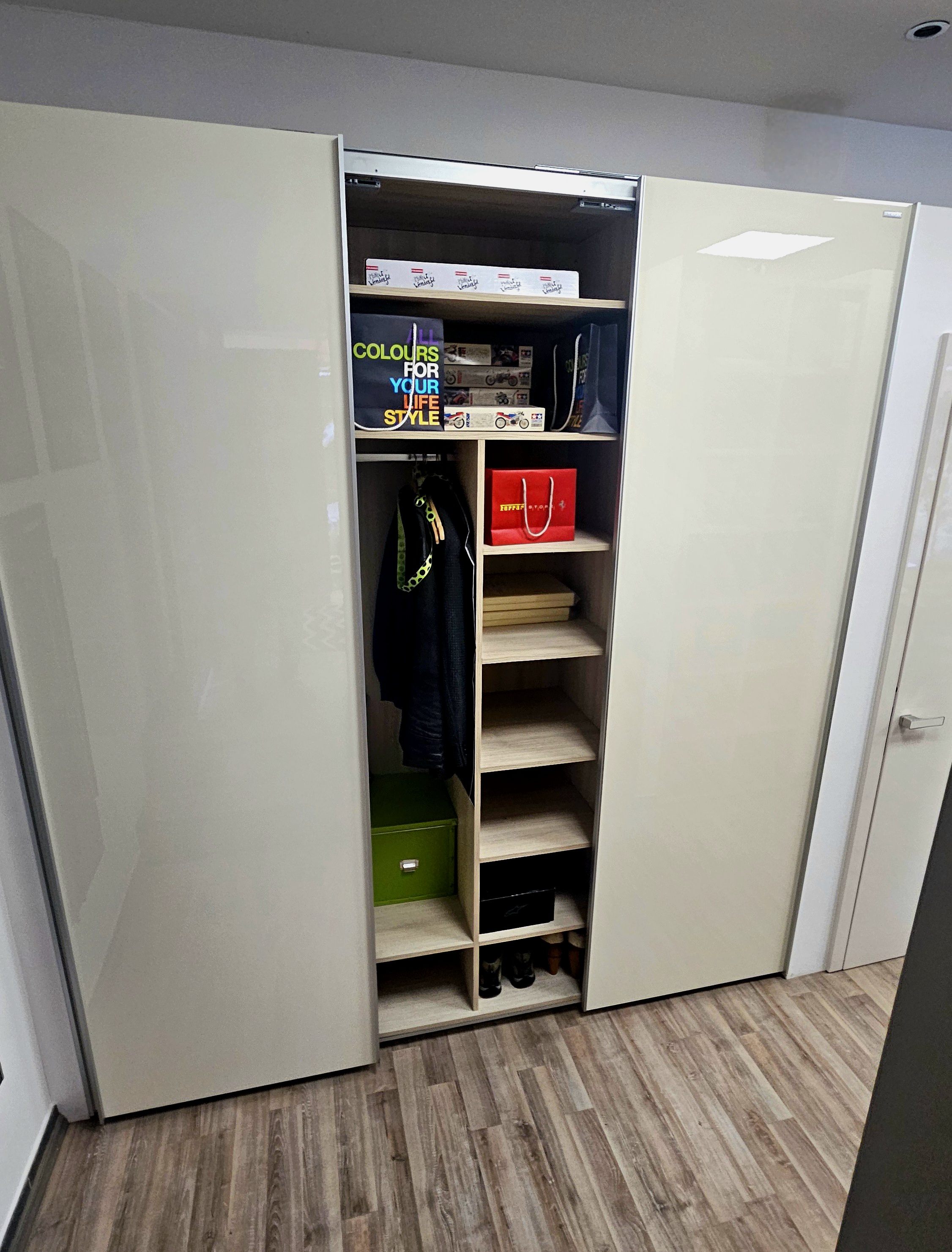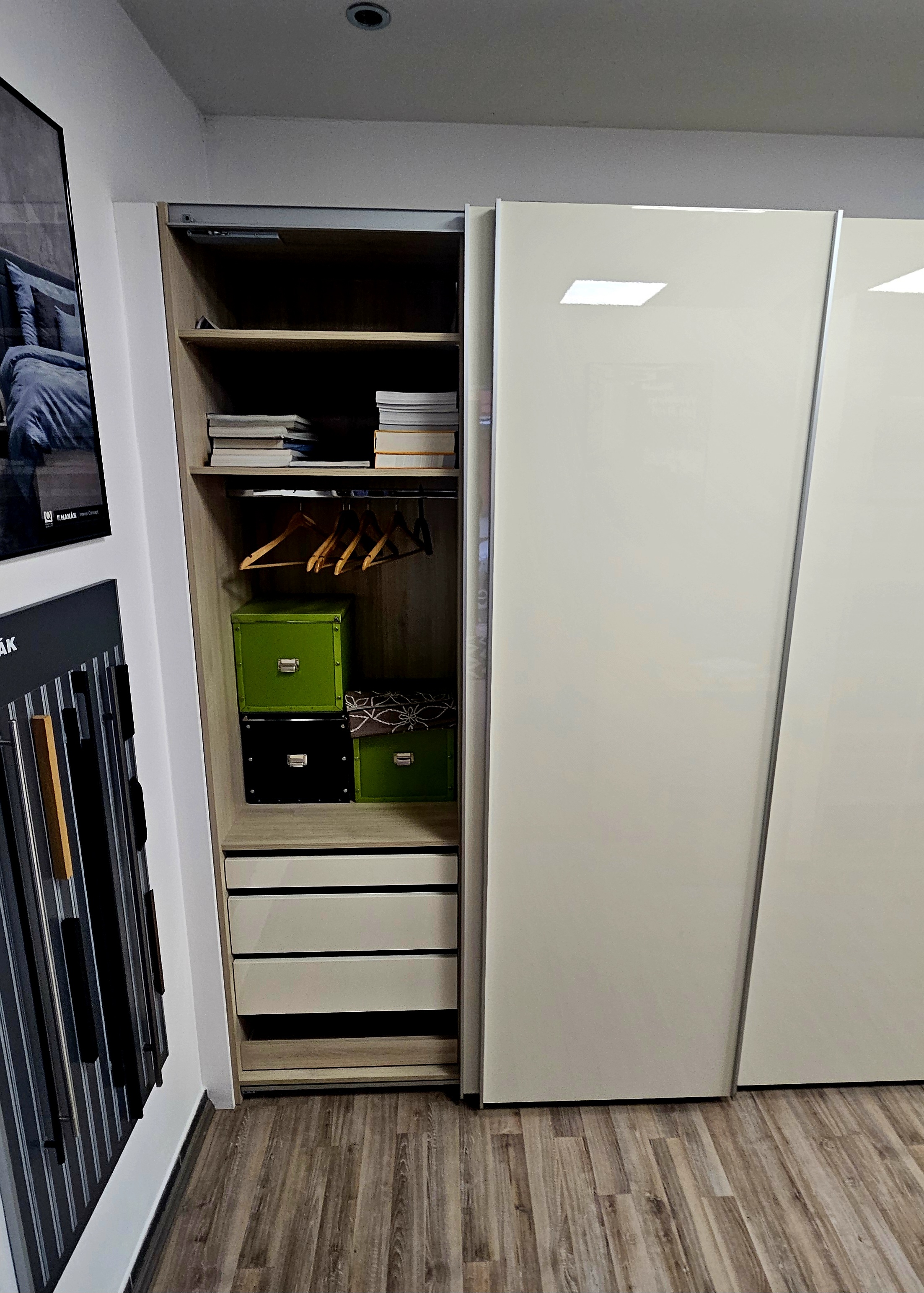 Jedná se o skříň s posuvnými dveřmi v provedení lak S43L magnolia lesk. Korpus dub Chamonix.